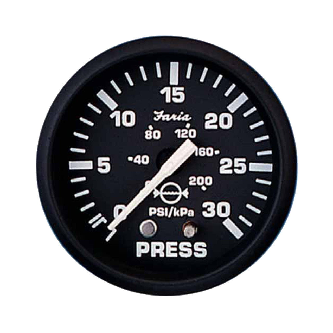 • Perimeter-lighted black dial with bold white graphics, black aluminum bezel, contoured white pointer and flat glass lens. • CE Certified. Made in USA.