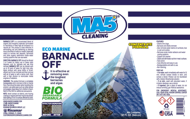Developed by industry experts, MA5X ECO MARINE Barnacle Off is a highly effective solution designed specifically for removing stubborn marine deposits. Its concentrated formula, consisting of both organic and inorganic ingredients, neutralizes high pH surfaces, eliminates rust and salt stains, and effectively removes barnacles, sea lime, and other organic sediments. Ideal for water cooling systems that utilize seawater, each 32 oz bottle ensures a powerful and versatile solution.